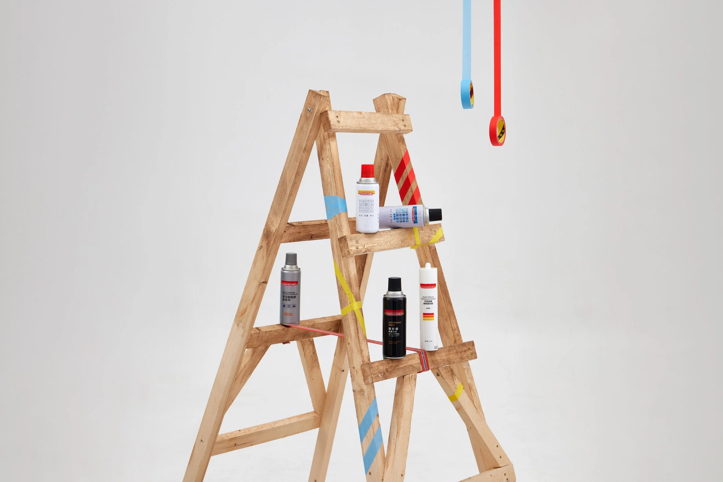 Targeted at Gen Z buyers on Chinese e-commerce platforms. Props sourced from the DIY world — wooden ladders, cardboard furniture, washi tape — to build a visual language of creative repair culture rather than utility.
